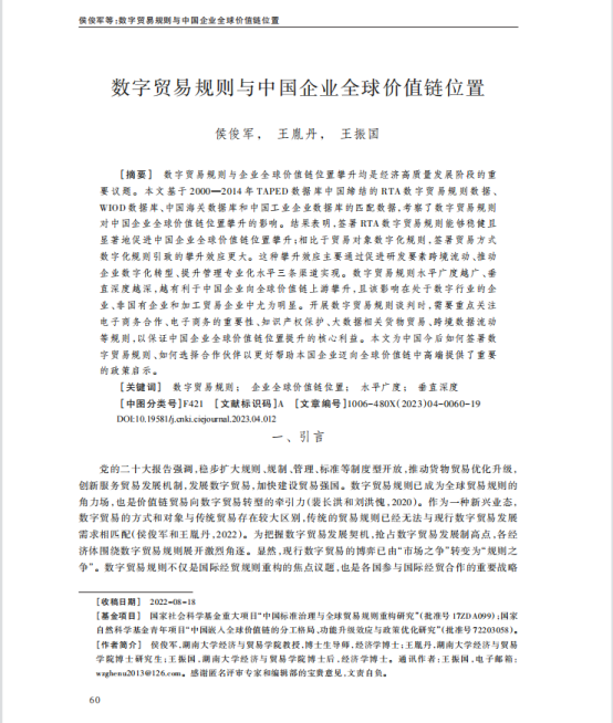 侯俊军教授、王胤丹博士以及王振国博士后合作撰写的学术论文《数字贸易规则与中国企业全球价值链位置》在《中国工业经济》2023年第4期刊出。《中国工业经济》期刊由中国社会科五楼自拍