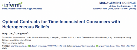 高步渠助理教授与香港城市大学郭亮教授合作的研究成果以“Optimal Contracts for Time-Inconsistent Consumers with Heterogeneous Beliefs”为题在管理学国际顶尖期刊Management Science发表。Management Science期刊创办于1954年,由美国运筹学与管理学学会主办,是管理学、运筹学领域的顶级期刊。该期刊是美国德克萨斯大学达拉斯分校遴选的24本商五楼自拍