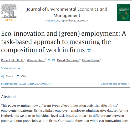主要观点:本文探讨了不同类型的生态创新活动如何影响企业的就业模式。使用荷兰的雇主-雇员关联行政数据集,我们采用基于个人任务的方法来区分企业内部的绿色和非绿色工作。我们的研究结果表明,尽管生态创新对整体就业没有影响,但生态产品创新确实导致绿色工作岗位增加了19.72%。绿色工作岗位的增长主要来源于绿色工人的小幅但显著的增加和非绿色工人的减少所导致的就业组成变化。进一步分析表明,自愿进行生态创新的企业创造了更多的绿色工作岗位,但推动绿色就业增加的主要是补贴驱动的政策,而不是更严格的法规。