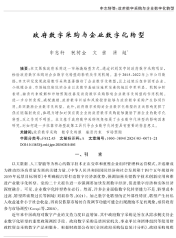 本文以2015~2022年中国A股上市公司为研究对象,通过识别政府采购合同中的数字采购项目,检验政府数字采购对企业数字化转型的影响及作用机制。研究发现:扩大政府数字采购规模有助于推动企业数字化转型,在采用Bartik工具变量等进行内生性检验后结论依然稳健。且在非国有企业、小规模企业、市场地位较低的企业以及数字基础设施更完善的地区中,政府数字采购对企业数字化转型的积极作用更明显;从机制来看,政府数字采购通过缓解企业的融资约束、改善企业的市场预期进而促进企业数字化转型。进一步分析发现,实施减税激励、提供政府数字补贴能够发挥不同政策工具的协同作用以推动企业数字化转型,且社会资本中的风险投资同样能强化政府采购的积极作用。此外,政府数字采购对企业数字化转型的正向影响发挥了供应链辐射效应,体现为对供应商企业的政府数字采购增加能够激励下游企业的数字化转型,反之作用不明显。