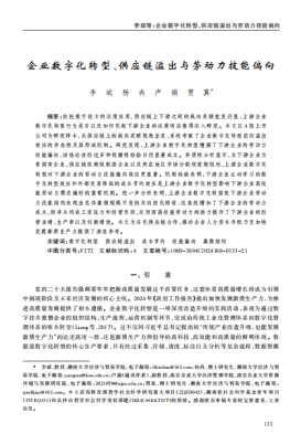 本文从供应链上的纵向关联视角出发,以A股上市公司为考察对象,探究上游企业数字化转型对下游企业劳动力技能偏向的影响及作用机制。主要结论如下:第一,企业数字化转型存在前向溢出效应,上游企业数字化转型显著增强了下游企业对高技能劳动力的需求偏好。第二,当下游企业为非国有企业、供应链依赖性较高企业以及所在地区市场分割程度较低时,上游企业数字化转型对下游企业的劳动力技能偏向效应更显著。第三,上游企业数字化转型主要通过下游企业数字化转型效应和成本节约效应两条渠道影响下游企业劳动力技能偏向,具体表现为推动下游企业主动学习而非被动模仿型数字化转型和降低外部交易成本。第四,上游企业数字化转型使下游企业劳动力技能结构表现出总体雇佣规模保持不变条件下的双向极化特征,即下游企业对高技能劳动力的需求偏好通过减少对低技能劳动力的雇佣来满足。第五,虽然上游企业数字化转型引致下游企业增加对高技能劳动力的需求提升了劳动力成本,但并未构成工资压力和经营负担,反而因高技能劳动力的助力改善了下游企业的经营业绩、生产率以及创新绩效。