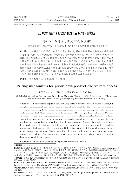 刘征驰教授、博士生李慧子、24届博士陈文武和高步渠副教授合作撰写的学术论文《公共数据产品定价机制及其福利效应》在《系统工程理论与实践》2025年第3期刊出。《系统工程理论与实践》期刊是由中国科学技术协会主管、中国系统工程学会主办的集系统科学、管理科学、信息科学等为一体的重要学术期刊。