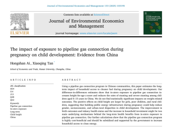 艾洪山教授与谭小清博士合作论文“The impact of exposure to pipeline gas connection during pregnancy on child development: Evidence from China”被资源与环境经济学领域顶级期刊《Journal of Environmental Economics and Management》(JEEM)录用刊出。《Journal of Environmental Economics and Management》在环境经济学领域具有较高的影响因子(IF 5.5),是该领域权威顶级期刊,在经济学界享有良好声誉和广泛认可度,是五楼自拍