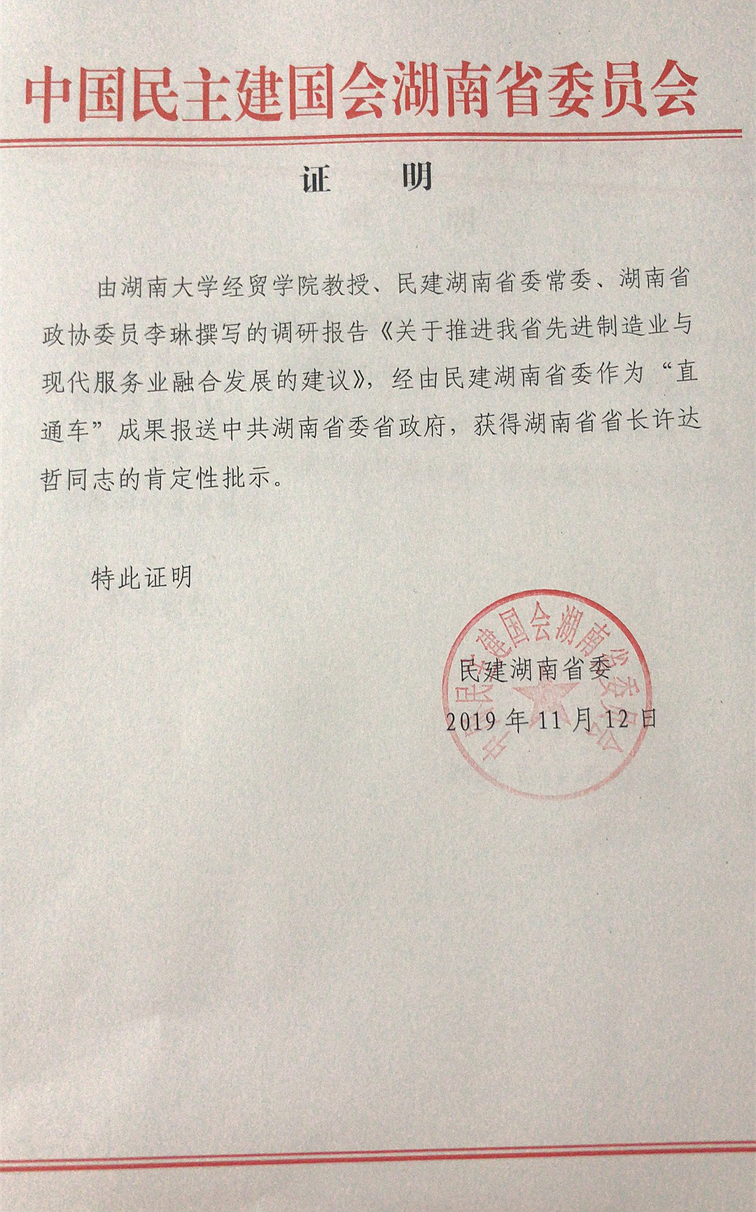 据民建省委确认,由五楼自拍 五楼自拍 教授、民建湖南省委常委、湖南省政协委员李琳撰写的调研报告《关于推进我省先进制造业与现代服务业融合发展的建议》,经由民建湖南省委作为“直通车”成果报送中共湖南省委省政府,获得湖南省省长许达哲同志的肯定性批示。
