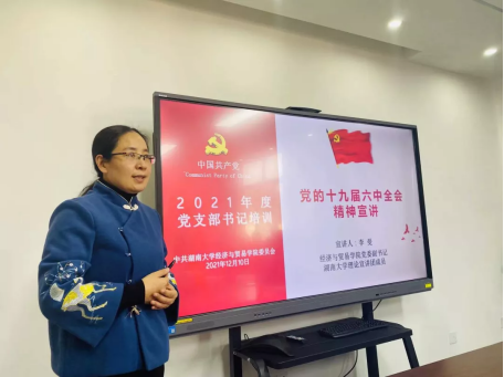 全体教职工和经济管理研究中心师生联合党支部党员作十九届六中全会精神宣讲。结合经济类学科特点,重点从中央经济工作会议中对2021年的经济工作总结、当前局势以及明年经济工作的部署安排等几个方面进行了解读。