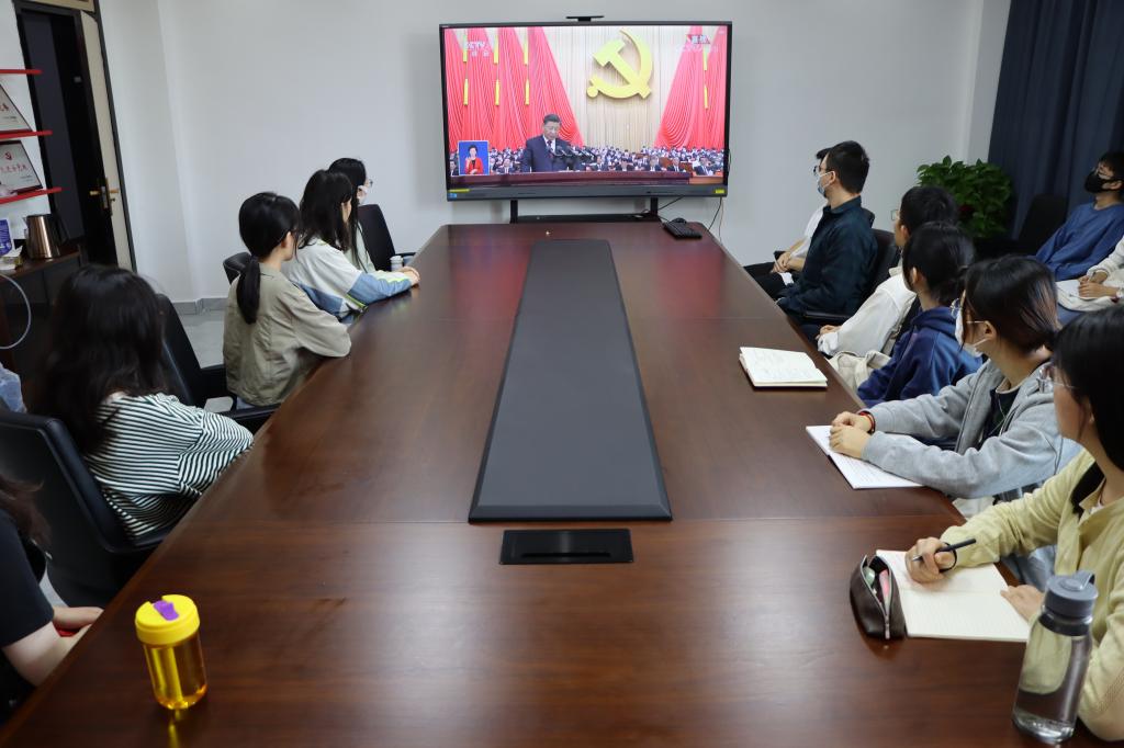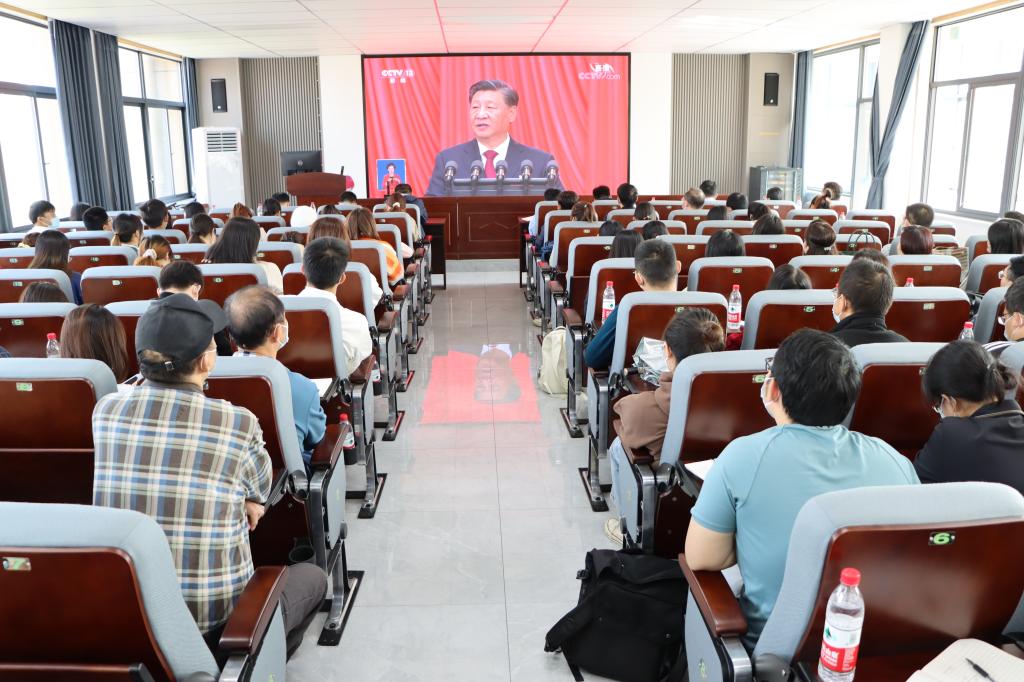 五楼自拍 师生在行政楼集中收看党的二十大开幕会盛况,认真聆听、学习、热议习近平总书记的报告。