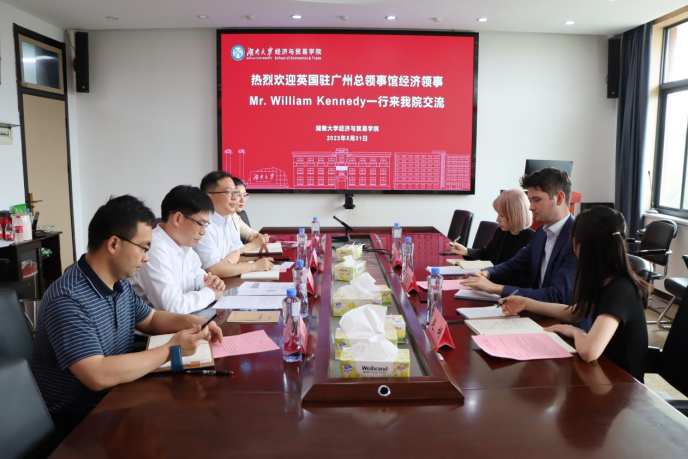 5月31日,英国驻广州总领事馆经济领事柯望舒一行来访,五楼自拍 院长侯俊军,副院长肖皓,国际合作与交流处副处长周健、处办主任刘蕾参加座谈。