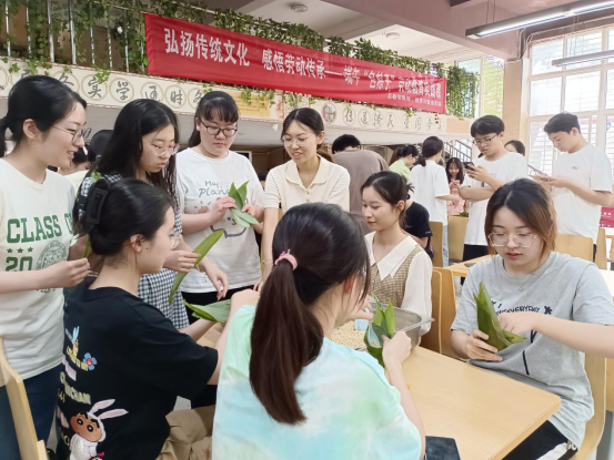 联合后勤保障部开展端午主题劳动教育实践。同学们在食堂工作人员的带领下,折粽叶、填糯米、裹叶子、扎棉线,一道道工序有条不紊。粽叶青,糯米白,棉线长,食堂内粽香飘扬,同学们在劳动中感受到了包粽、食粽的乐趣,也感受到了传统节日文化的魅力。