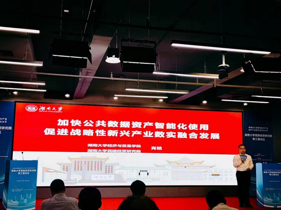 副院长肖皓教授以“加快公共数据资产智能化使用 促进战略性新兴产业数实融合发展”为题做主旨演讲,就数字经济的“赋能”作用、大数据的“智能”作用、战略性新兴产业的公共管理等问题做了演讲分析,并针对这些问题提出四点对策建议:一是建立支撑战略性新兴产业发展的“公共数据”空间;二是打造“公共数据”支撑战略性新兴产业发展的应用场景;三是建立中小微科技企业的公共数据智能服务体系;四是探索基于公共数据资产的战略性新兴产业政策智能服务。