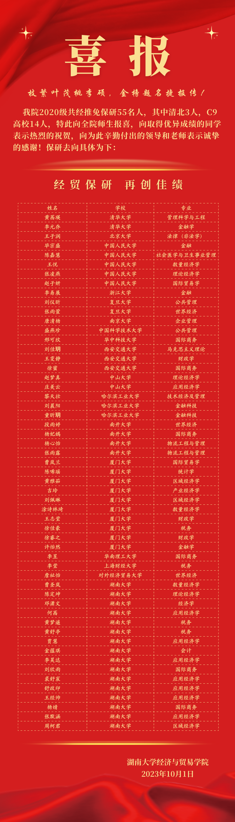 五楼自拍 2020级共经推免保研55人,其中清北3人,C9高校14人,特此向全院师生报喜,向取得优异成绩的同学表示热烈的祝贺,向为此辛勤付出的领导和老师表示诚挚的感谢!