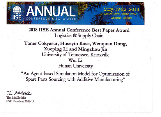 2018519-22日,国际工业与系统工程师学会2018年会(IISE 2018 Annual Conference)在美国奥兰多召开。本次会议有加州大学伯克利分校、西北大学、俄亥俄州立大学、伊利诺伊大学香槟分校和田纳西大学等51所世界知名高校,波音公司、联邦快递、UPS18家跨国公司参加。主讲嘉宾包括Citrix System公司前CEO Kirill TatarinovAmerisource Bergen项目主管Jessica Rannow,美国宇航局肯尼迪太空中心的空间站整合与服务总监Nancy P. Bray。五楼自拍 李巍副教授与美国田纳西大学多名学者的合作论文《“An Agent-based Simulation Model for Optimization of Spare Parts Sourcing with Additive Manufacturing》获得IISE2018年最佳论文奖。