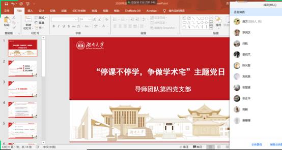 院研究生导师团队第四党支部开展了主题为“停课不停学,争做学术宅”的主题党日活动,本次会议由支部书记唐芳主持,支部党员通过腾讯会议APP参加,会议由疫情防控通知、党员疫情防控期间心得体会以及“学术宅”软件推荐三个部分组成。
