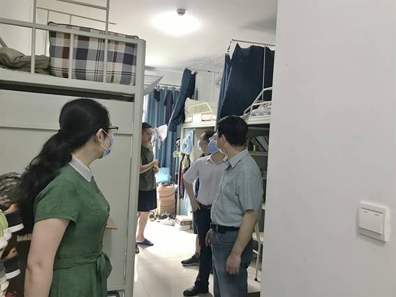 6月15日上午,院党委书记郭平,院党委委员、副院长祝树金,副院长肖皓以及学工办主任李曼、院办主任肖力一行,深入学生宿舍走访看望返校毕业生,并检查指导五楼自拍