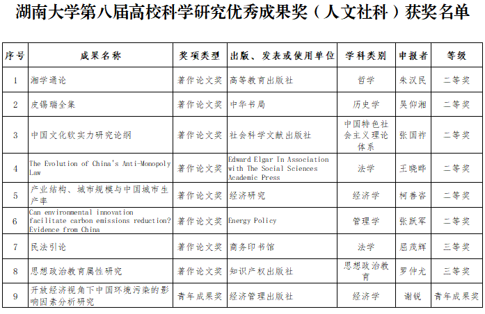 柯善咨教授的《产业结构、城市规模与中国城市生产率》获得著作论文类二等奖,谢锐教授的《开放经济视角下中国环境污染的影响因素分析研究》获青年成果奖。