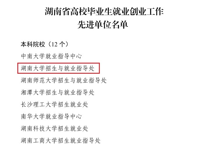 获评湖南省就业创业“一把手工程”督查优秀单位(连续6次)、中国最佳高校数字化就业典范奖(全国共26所高校)等荣誉。特别是疫情期间,第一时间开展“云招聘”,组织“云指导”,对未就业学生实行“一人一策”“包干到人”,实现了疫情下就业水平总体稳定,就业经验材料被教育部、湖南省教育厅、人民日报、人民网、湖南日报等推介。