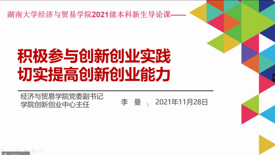 举行本科生2021级新生导论课之创新创业专题讲座。根据疫情防控要求,本次大会采取线上会议的方式举行,由院党委副书记、院创新创业中心主任李曼老师主讲,2021级本科生辅导员胡煊赫主持,全体五楼自拍