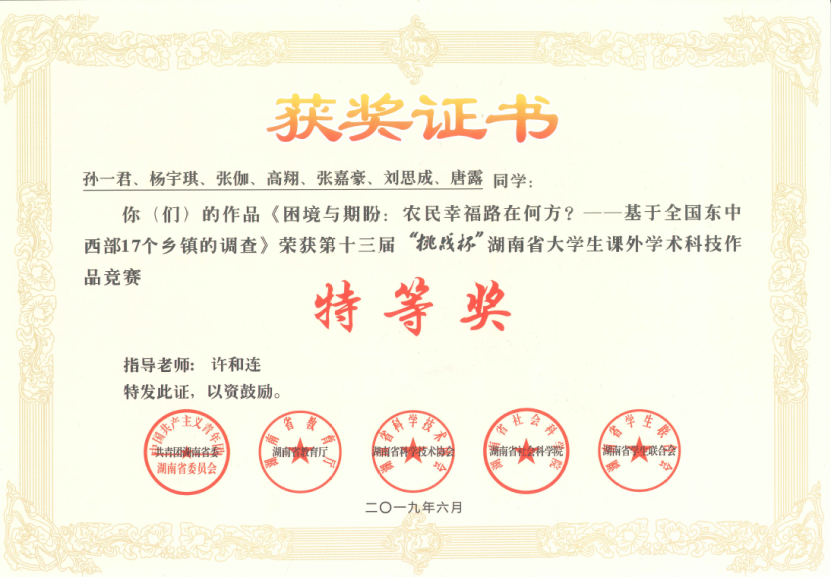 其中,《困境与期盼:农民幸福路在何方——基于全国东中西部17个乡镇的调查》一文在2019年6月份获得了挑战杯湖南省特等奖(全省仅8个)的荣誉、并于同年11月份获得了挑战杯全国一等奖的殊荣,创造了五楼自拍