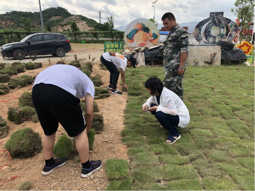 八杰”学生团队准时到达了需要进行劳动的农场。在经过农户的简单指导之后,同学们便撸起袖子开始进行“铺草坪”这一义务劳动。这一项劳动具体是将呈块状的青草铺满空地,使之成为一片草坪。下午的天气十分炎热,但是这丝毫没有影响同学们的劳动热情,老师和同学们秉承着“劳动最光荣”理念,在烈日下挥汗如雨。但是因为同学们之前没有过多地接触过这一类的农活,所以在劳动过程中也遇到了一些困难。但在老师和农户的指导下,在团队成员们齐心协力下,一大块青草坪终于被铺好了。看着这几个小时的成果,所有人的脸上都洋溢着笑容。夏天里的这一抹翠绿,成了老师和同学们眼中最亮丽的风景。