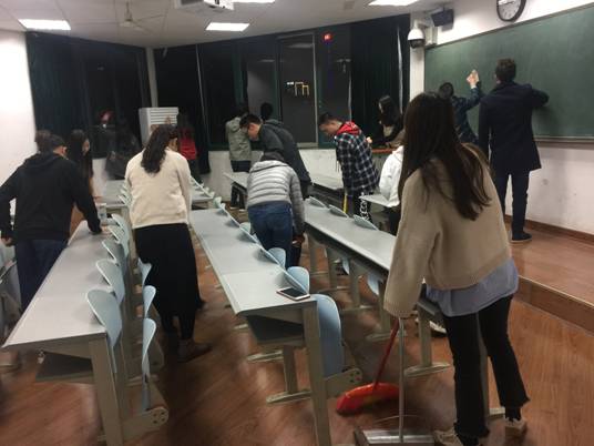 为了不打扰同学自习,第11小组的同学在晚餐的时间空歇里来到水上教学楼414教室,快速开展清洁活动。14名同学到达教室后,根据提前确定的分工,自带打扫工具,迅速开始打扫工作。14个人均有负责的工作:擦黑板、清理课桌、整理讲台、扫地、拖地、擦窗户、擦空调,大家有条不紊地做着手里的工作,原本需要花费较多时间的清扫工作在小组成员的齐心协力下迅速完成。