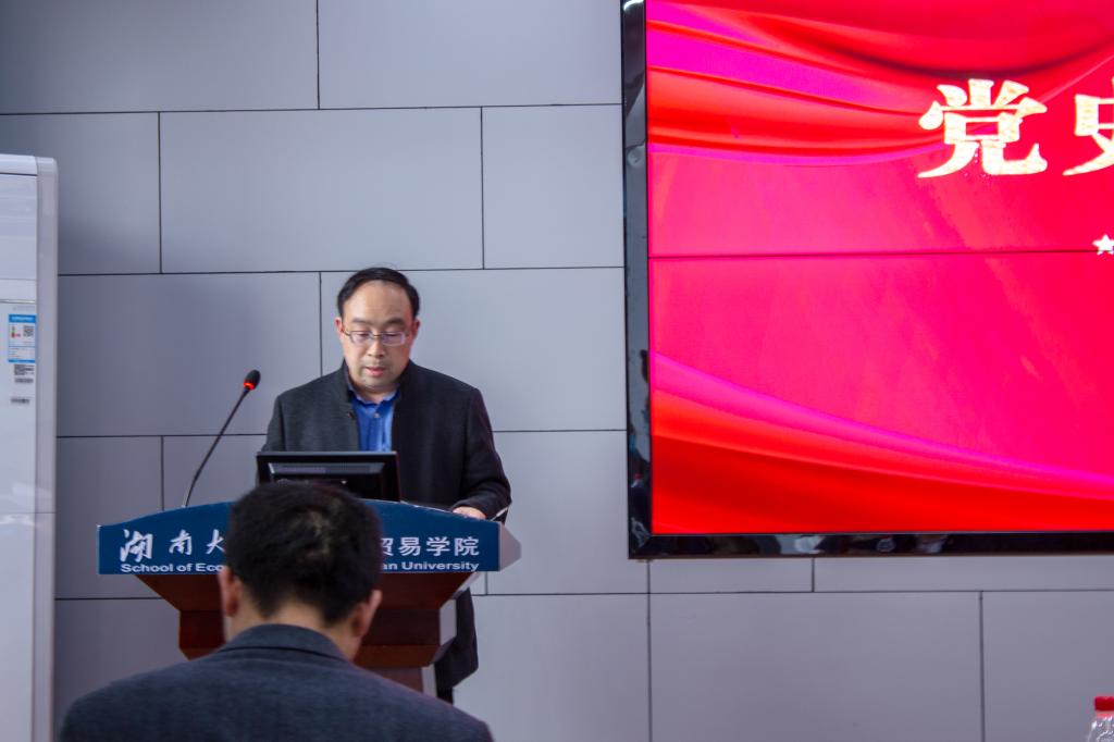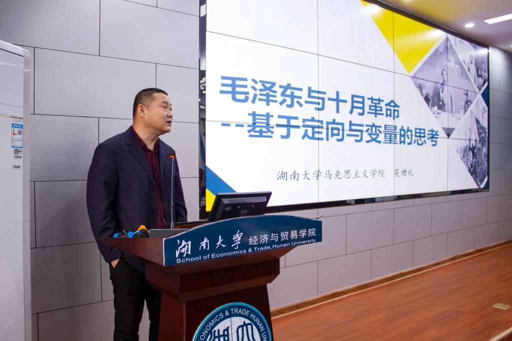 副院长吴增礼以“毛泽东与十月革命——基于定向与变量的思考”为主题,生动讲授了党史专题党课。吴增礼将党史与经济学相结合,通过“定向”和“变量”的阐述生动介绍了十月革命时期毛泽东同志为何选择共产主义道路的这一段历史。