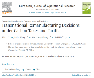 李巍教授、王沛麟博士生、本科毕业生程文成、聂凯副教授合作撰写的论文“Transnational Remanufacturing Decisions under Carbon Taxes and Tariffs”在European Journal of Operational Research在线刊出。European Journal of Operational Research为运筹学与管理科学领域国际权威期刊,ABS评级四星期刊。
