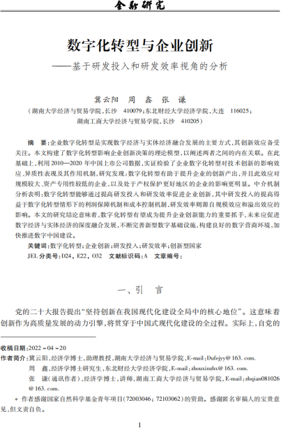 冀云阳助理教授与东北财经大学周鑫博士、湖南工商大学张谦副研究员合作撰写的学术论文《数字化转型与企业创新——基于研发投入和研发效率视角的分析》在《金融研究》2023年第4期刊出。《金融研究》期刊由中国人民银行主管、中国金融学会主办,是我国经济学领域的权威学术期刊。