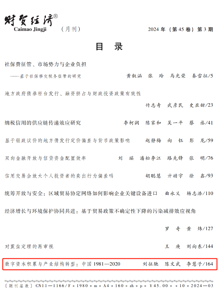 刘征驰教授、陈文武、李慧子博士合作撰写的学术论文《数字资本积累与产业结构转型:中国1981-2020》在《财贸经济》2024年第3期刊出。《财贸经济》期刊是是中国社会科五楼自拍