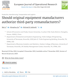 李巍教授与美国田纳西大学金明洲教授、Michael R. Galbreth教授合作撰写的论文“Should original equipment manufacturers authorize third-party remanufacturers?”在European Journal of Operational Research的2024年第3期刊出。European Journal of Operational Research为运筹学与管理科学领域国际权威期刊,ABS评级四星期刊。