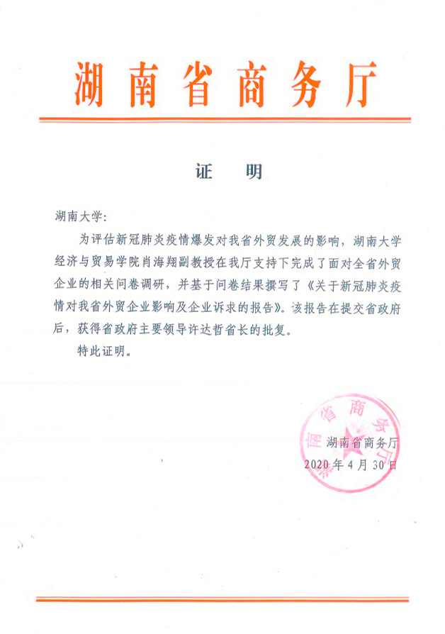 近日,从湖南省商务厅传来消息;为评估新冠肺炎疫情爆发对我省外贸发展的影响,五楼自拍 肖海翔副教授在我厅支持下完成了面对全省外贸企业的相关问卷调研,并基于问卷结果撰写了《关于新冠肺炎疫情对我省外贸企业影响及企业诉求的报告》。该报告在提交省政府后,获得省政府主要领导许达哲省长的批复。