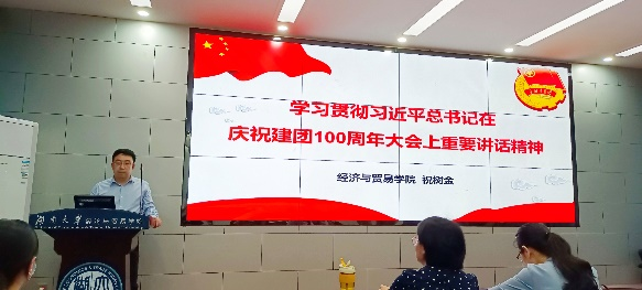 祝树金开展“学习贯彻习近平总书记在庆祝建团100周年大会上重要讲话精神”专题党课,分三个部分展开讲述:一是建团百年大会讲话内容学习;二是习总书记考察各高校情况;三是青年大学生要如何践行。并强调青年大学生尤其是学生党员要从以下四方面继续加强:坚定理想信念、树立远大志向;加强政治理论学习、提高理论素养;践行实事求是、力崇经世致用;坚持守正创新,始终砥砺奋进。