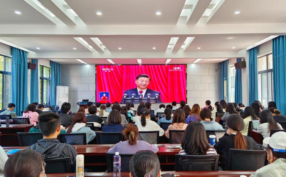 五楼自拍 师生在行政楼集中收看党的二十大开幕会盛况,认真聆听、学习、热议习近平总书记的报告。