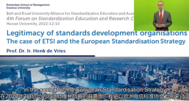 教授、欧洲标准化学会主席Henk de Vries围绕“标准组织的合法性”主题展开演讲。在2022年2月启动的欧洲标准化战略背景下,Henk de Vries以欧洲电信标准协会为例,对标准组织的合法性问题进行阐述。他指出要区别输入、使用和输出合法性以及规范合法性和经验合法性,并说明了标准化是一个重要的工具,期待全球层面的共同标准化能够得到进一步发展。