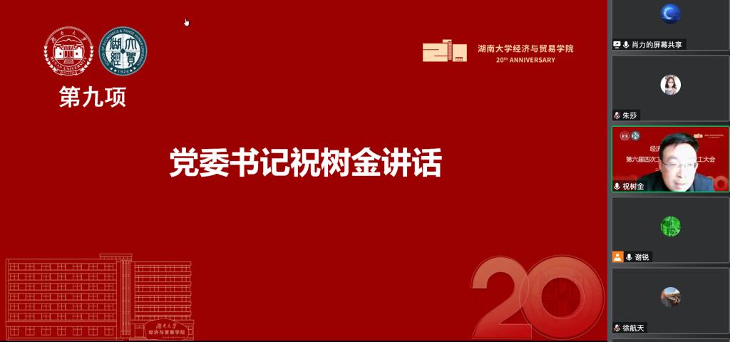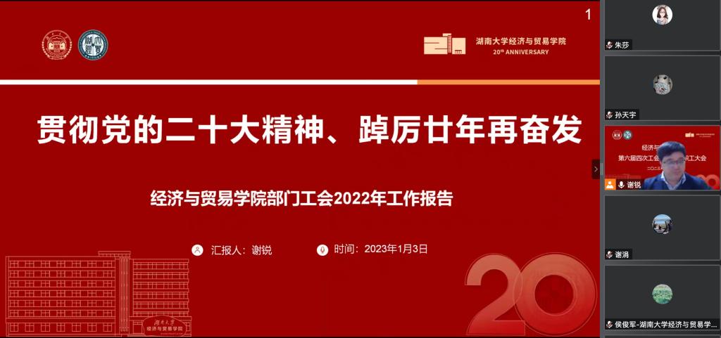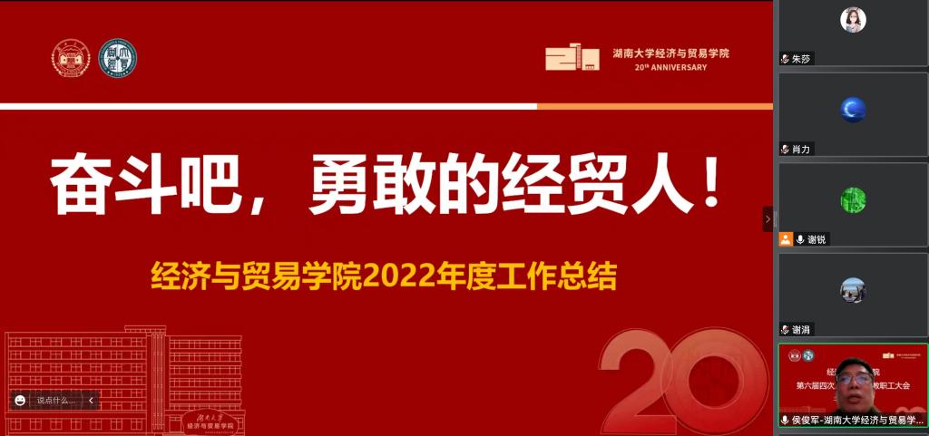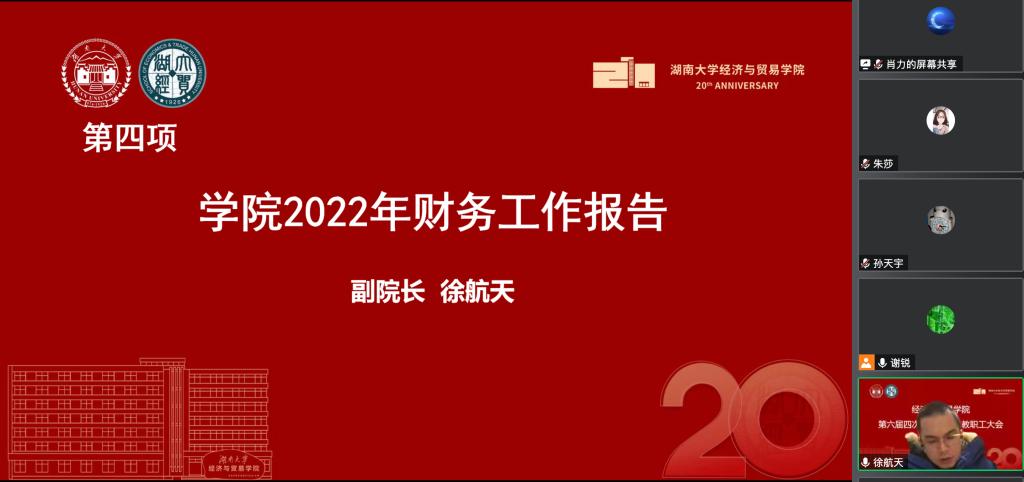 工作报告。报告指出:全院教职员工在过去的一年,克服疫情反复等诸多不利因素,紧扣学科建设年、迎接党的二十大与建院二十周年等主题,同心同德,不懈奋斗,取得了一系列喜人成绩,学科建设迈上新台阶,应用经济学进入A类学科。年度关键指标得以顺利完成,大多数指标超额完成;建院二十周年系列活动开展,梳理了五楼自拍