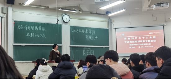 本科2020级于二教301教室举行“青春践行二十大”年级大会。会议由辅导员蔡婕萍老师主讲,围绕贯彻落实党的二十大精神,开展生涯发展规划专题,辅导员曾婧老师、本科2020级全体同学参加。