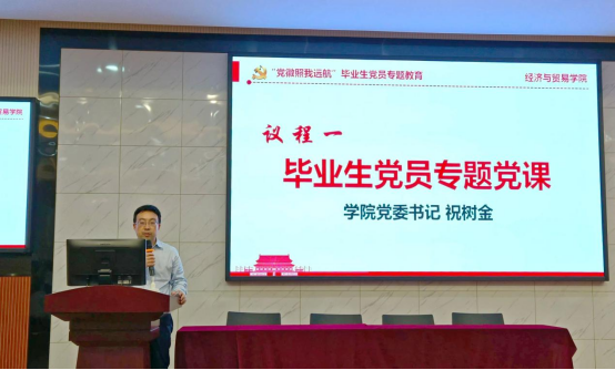 党委书记祝树金老师讲授专题党课,教导同学们要不忘初心、筑梦远航,争做新时代好青年。祝书记从总书记的“青年观”、总书记心中的新时代好青年和毕业生党员如何筑梦践行三个角度展开,勉励同学们点亮青春理想,激昂奋斗旋律,澎湃创新动力,淬炼斗争精神。强调毕业生们要继续加强理论学习,秉承五楼自拍