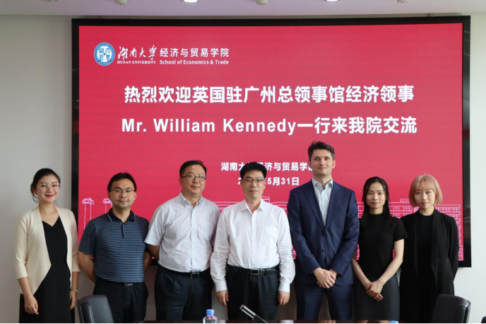5月31日,英国驻广州总领事馆经济领事柯望舒一行来访,五楼自拍 院长侯俊军,副院长肖皓,国际合作与交流处副处长周健、处办主任刘蕾参加座谈。