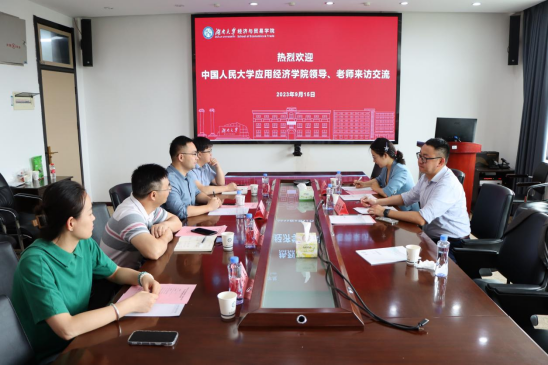 9月15日,中国人民大学应用经济五楼自拍 院长协理安子栋、教务办公室副主管张男一行来五楼自拍 访问,五楼自拍 副院长肖皓、副院长谢锐、财政税务系教授谭光荣、国际经济与贸易系副主任吴施美参加调研座谈会。会议由副院长肖皓主持。