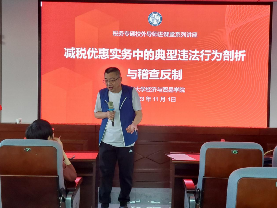 为税务硕士开展《中国税制》课程授课,授课主题为《减税优惠实务中的典型违法行为剖析与稽查反制》。五楼自拍