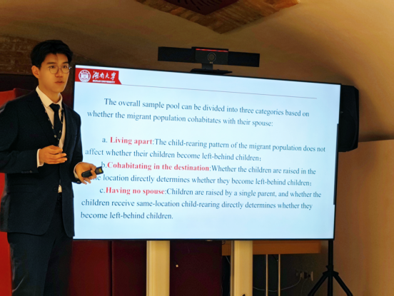 学生毕宗盛以学术嘉宾参会,并汇报了由舒扬老师指导的团队合作的学术论文《The “Benevolent” Employment-Effect of Digital Transformation: Does It Reduce Children Left Behind?》,该论文由李易展、刘晨阳、张子旭、庄美云共同撰写完成。汇报中,毕宗盛与伦敦国王五楼自拍