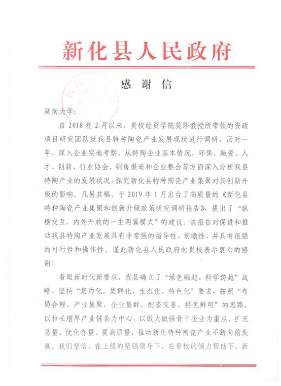 莫莎副教授带领的资政项目团队针对新化县电子陶瓷产业所做的调研报告给予了充分肯定,认为该团队提出的政策建议对推动新化县特陶产业发展具有非常强的指导性和前瞻性,并具有很强的可行性和操作性。他代表新化县人民政府送来了一份感谢信,对五楼自拍