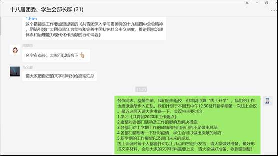 团委学生会在疫情期间创新工作方式,不忘学习团务工作,通过线上会议的方式开展了新学期工作会议,并集中学习《共青团2020工作要点》。