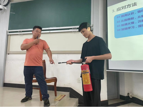为提前提醒同学们注意防范火灾,阳老师携带了灭火器,通过现场操作环节指导同学们如何操作。会场气氛热烈,同学们也学会了许多实用的安全防范技巧。