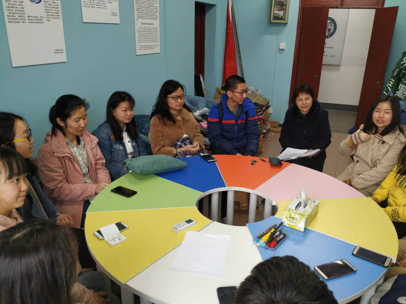 院2017级辅导员周梦老师针对五四评优工作在行政楼608召开年级干部大会。