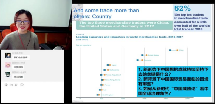 作为国际经济学课程组负责人,她在网络教学正式开始前就准备了三套线上教学预案,分别是雨课堂、腾讯课堂以及B站直播。考虑到各平台的使用频率,为了避免卡顿,她最终选择了B站直播+微信群的线上教学方式。作为双语学习的课程,有较高的教学难度,但她通过严谨细致、一丝不苟的态度,为同学们提供了一堂优秀的“云课堂”。此外,王腊芳老师对课程内容的诸多细致考虑,得到了同学们良好的反馈。大家在课堂中积极回答提问,课堂氛围十分热烈,甚至还吸引了很多其他观众,B站课程直播观看人数一度突破1000人!课后同学们对王腊芳老师的课堂好评如潮:“王腊芳老师的课堂特别有趣!知识点的讲述也特别细致!感觉学有所获!”