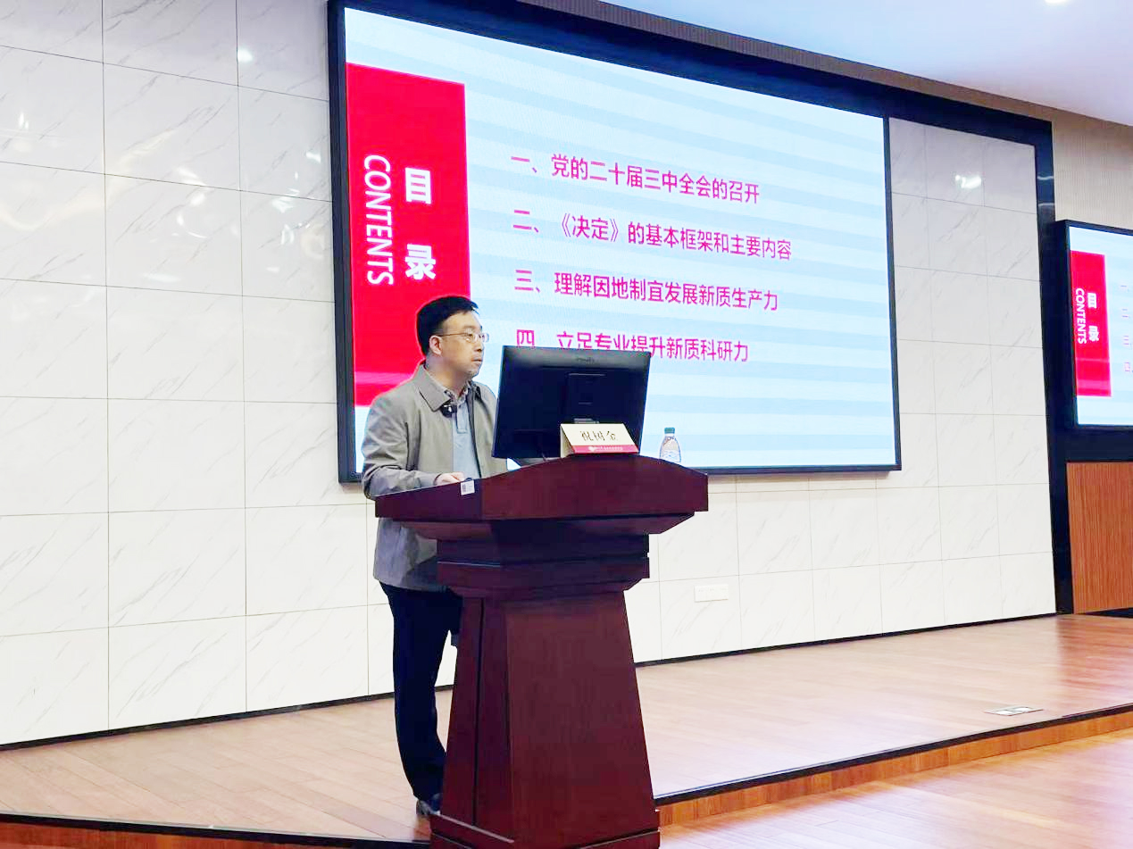 祝树金以党的二十届三中全会为主题,从会议召开、决定起草、决定的基本框架和主要内容等方面详细讲授了二十届三中全会的精神内涵,通过数据、文献等强调会议精神的重要意义。