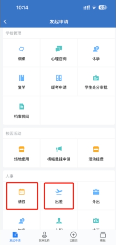 四、选择人事栏目中的“请假”或者“出差”,进行申请