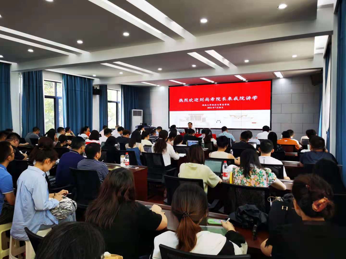 院长侯俊军主持,湖南省财政厅、湖南省税务局、长沙市税务局、长沙理工大学、湖南工商大学等单位代表及在校师生近两百人到现场聆听刘院长的讲座。